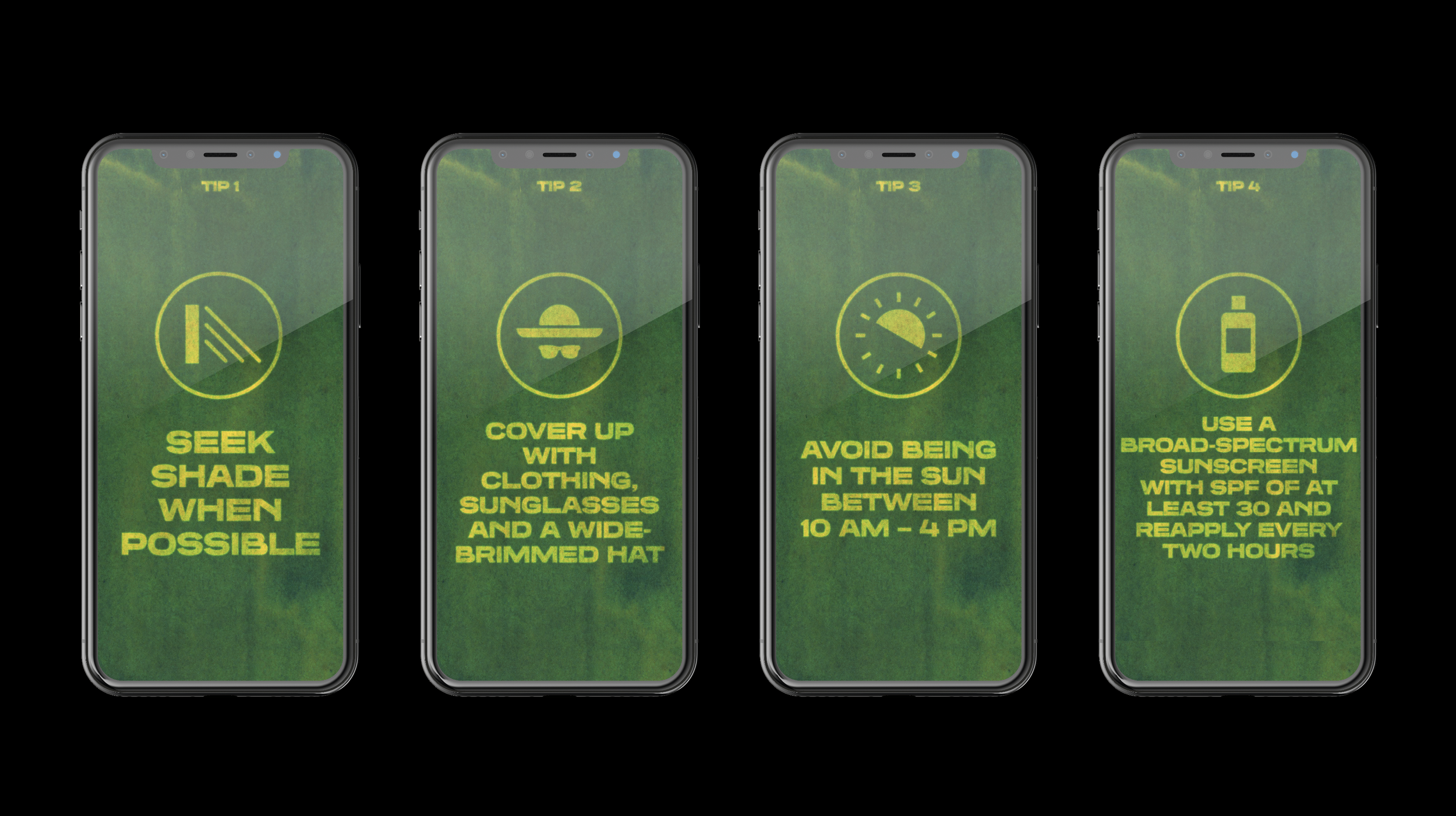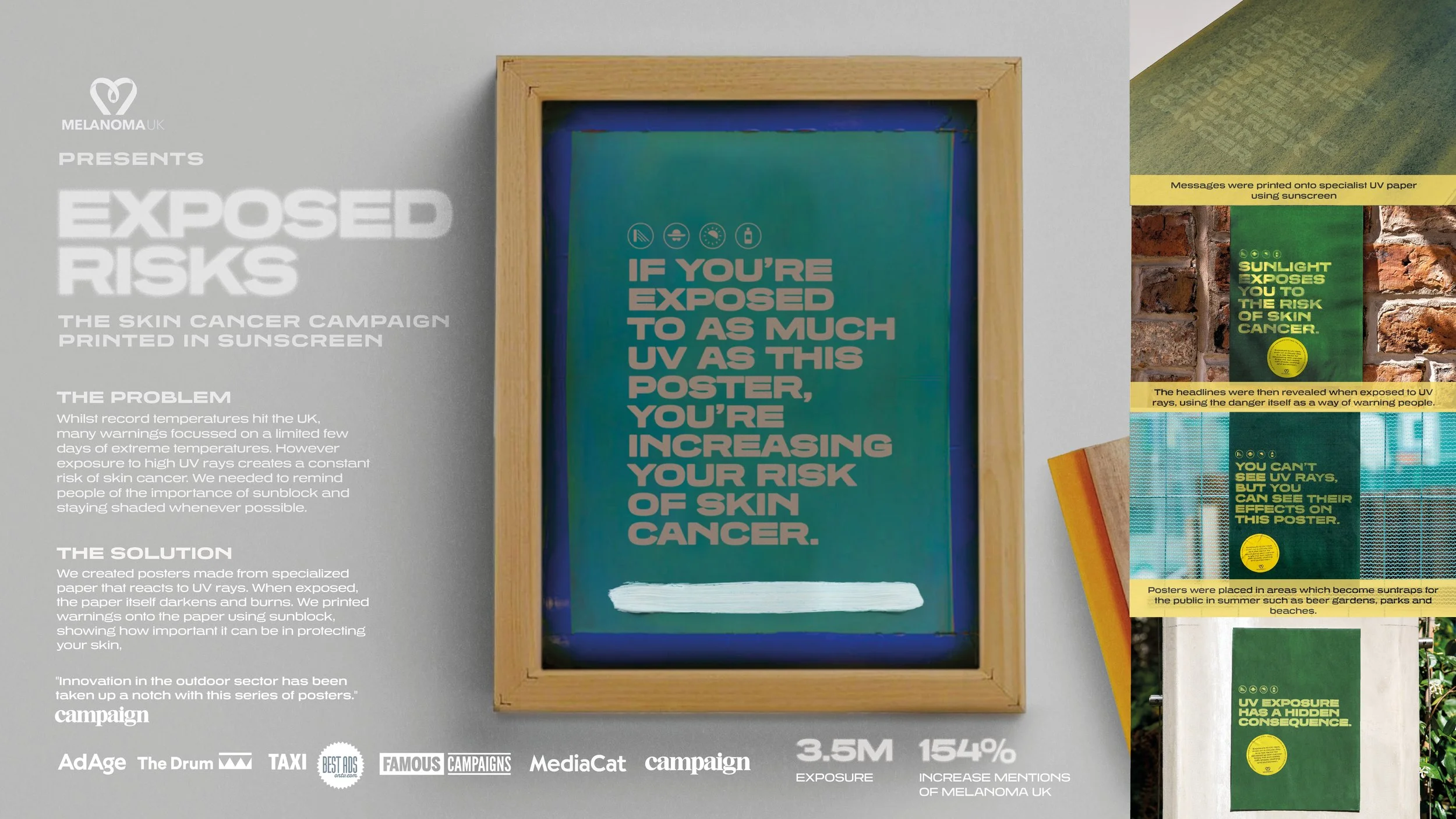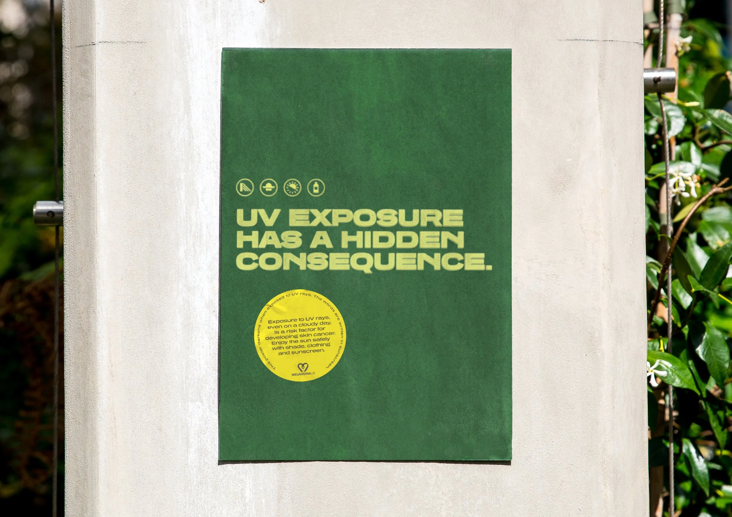 We created posters made from specialised paper that reacts to UV rays. When exposed, the paper itself darkens and burns. We printed warnings onto the paper using sunblock, showing how important it can be in protecting your skin.