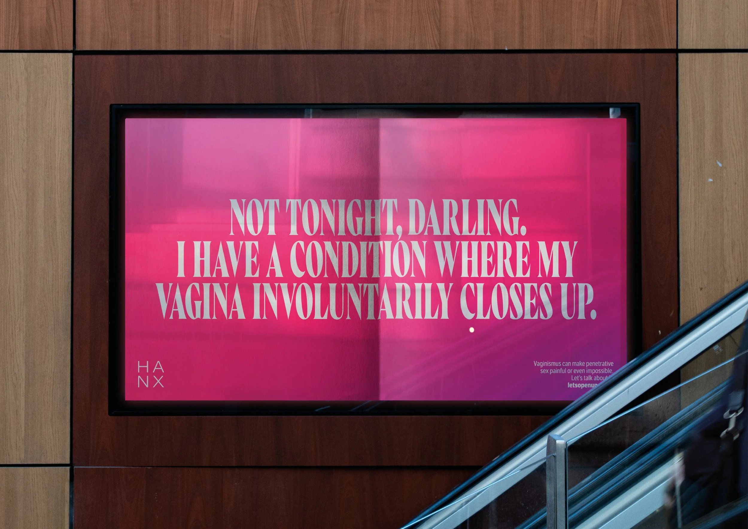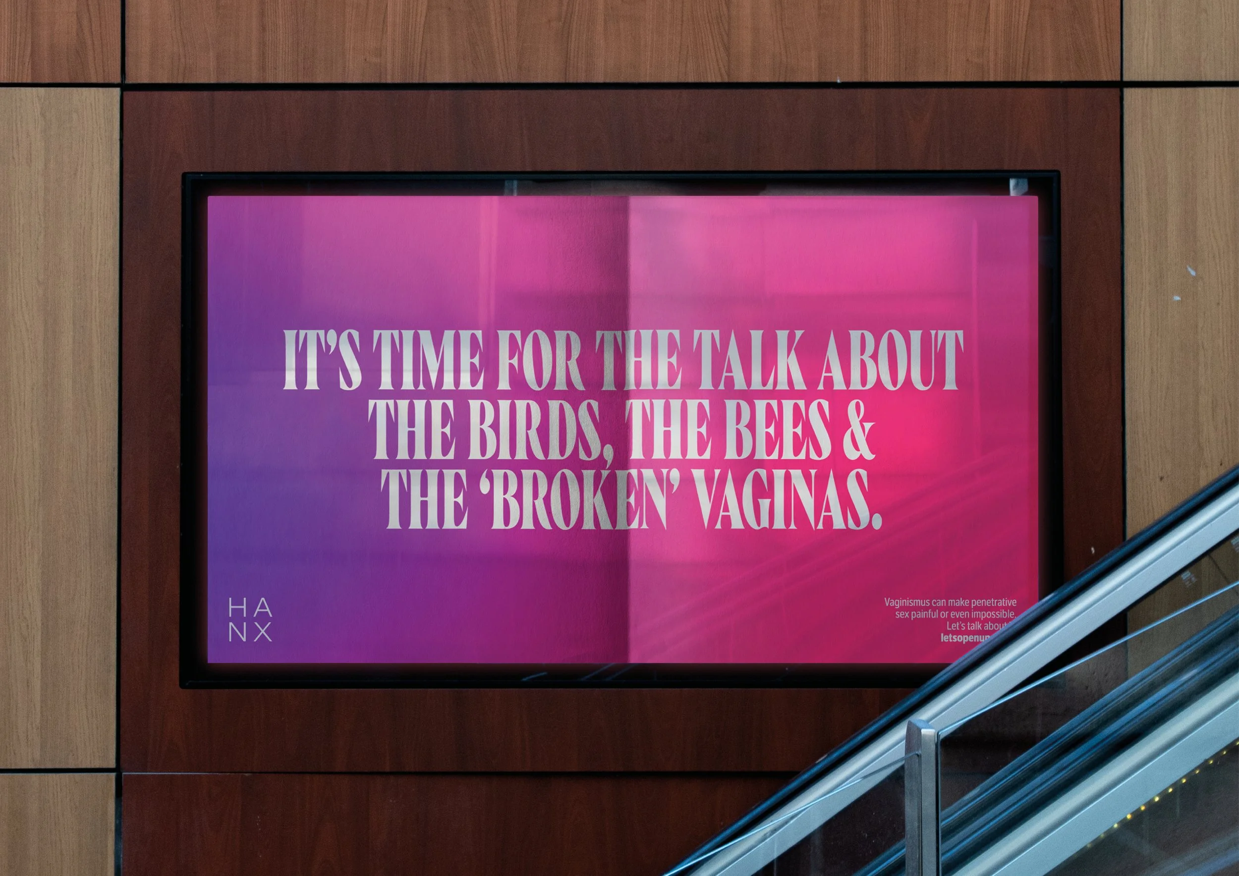 So through a straight-talking and unapologetic OOH and social campaign, HANX set out to make readers as uncomfortable reading about vaginismus as those living with it feel. Signposting readers to a bespoke website arming people with the language they need to talk about it with everyone from doctor to prospective partners.