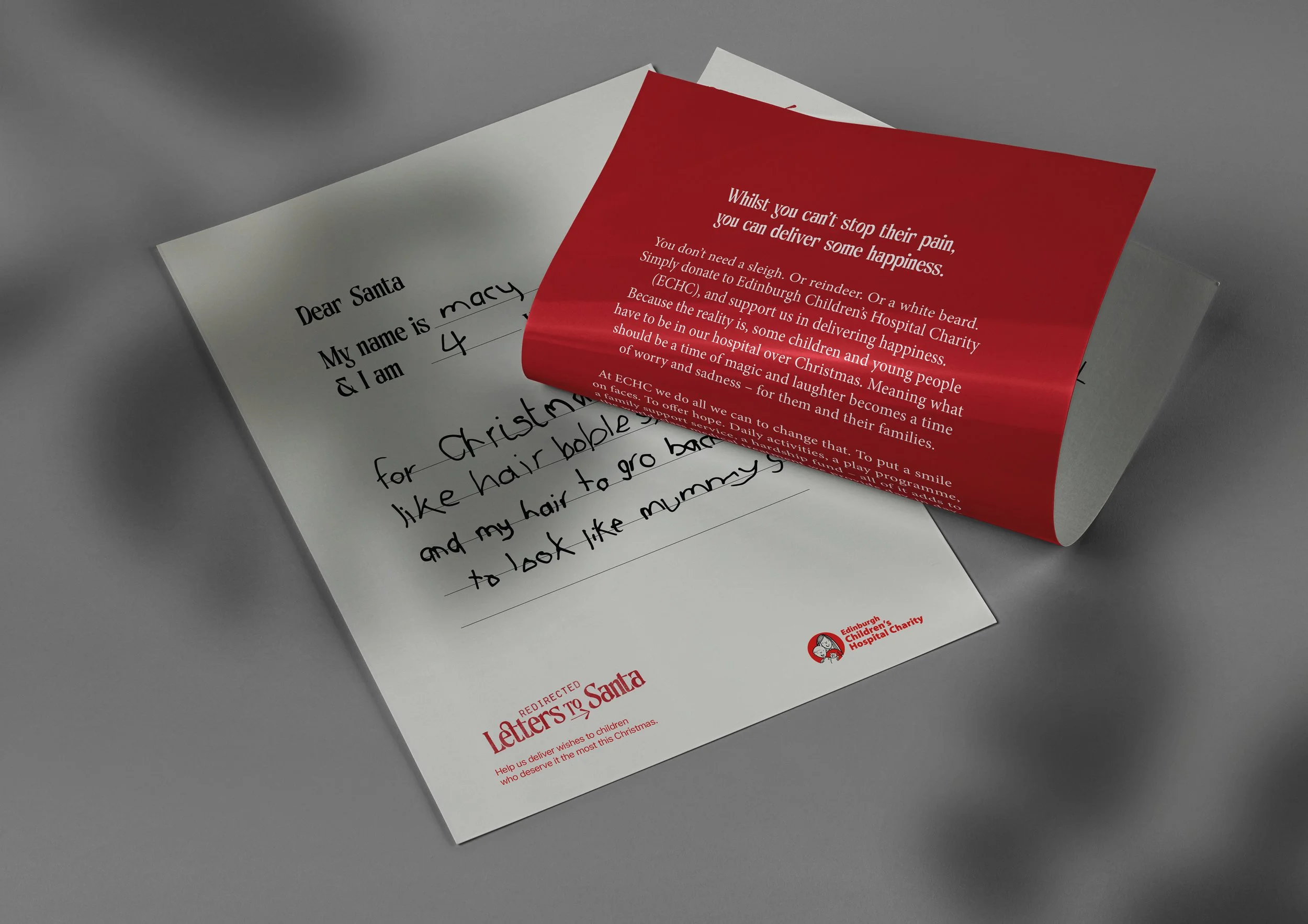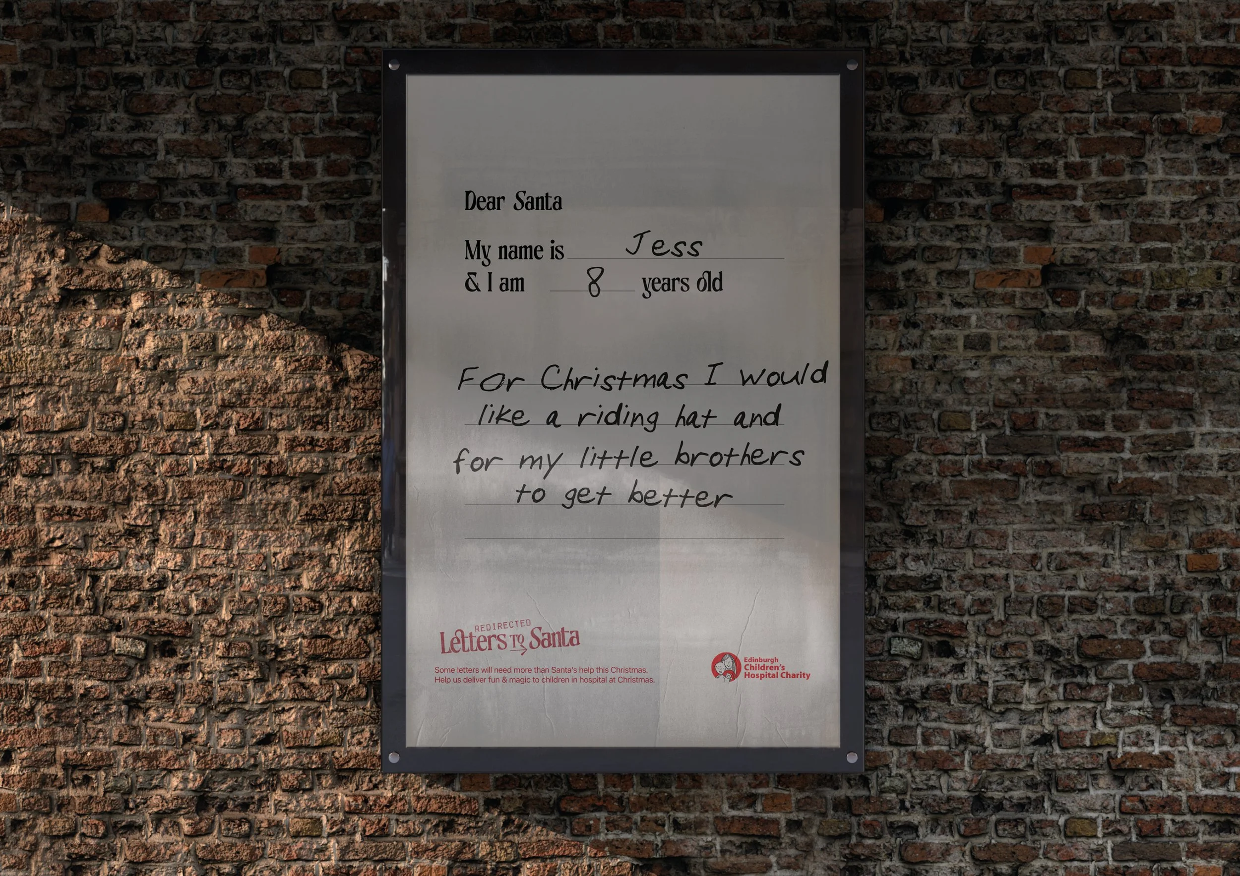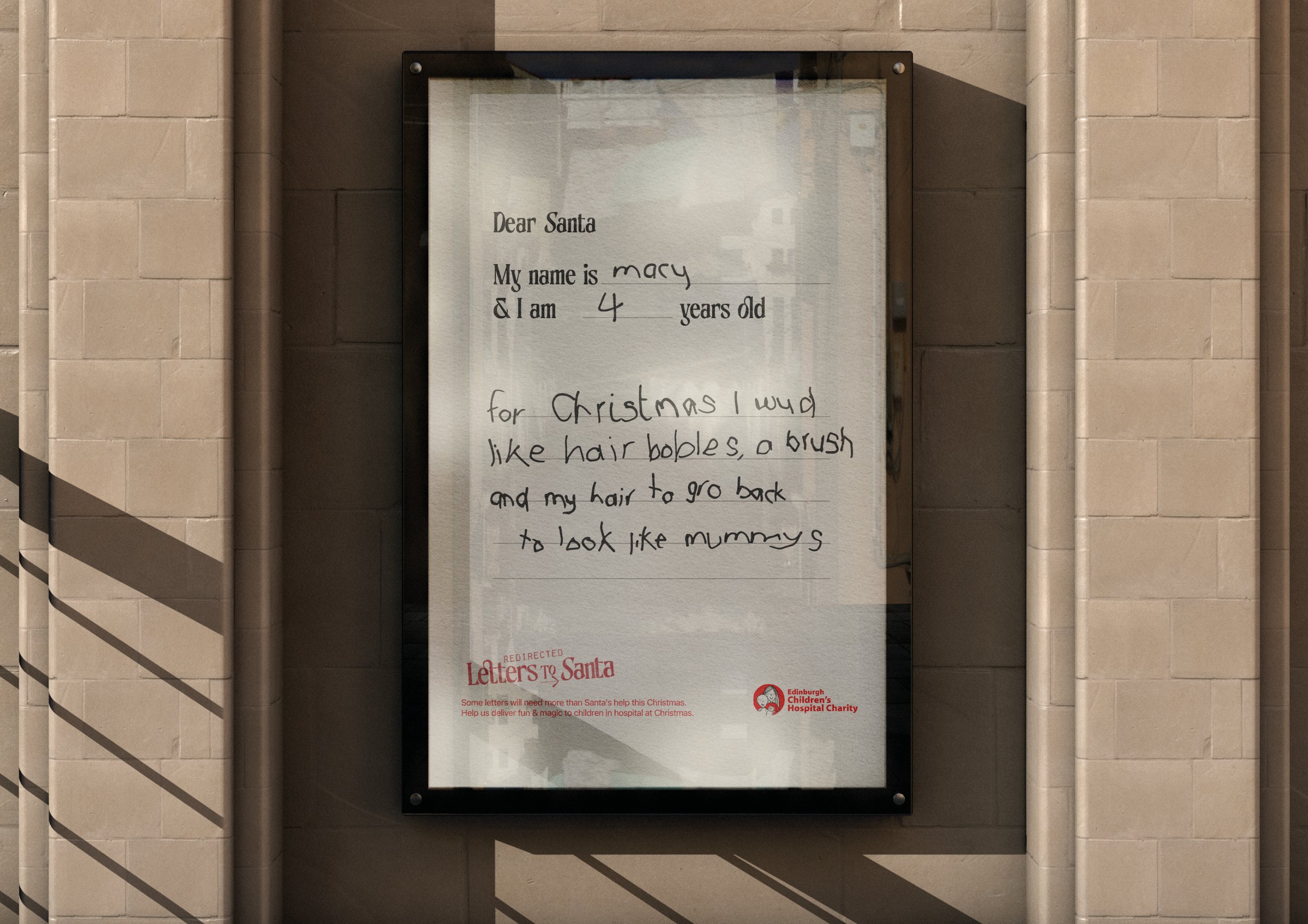 We asked children to write their Christmas list, but rather than sending them to Santa, we redirected them to residents of Edinburgh who could help deliver what they wanted. Letters were sent as direct mailers with the chance to become a donor. The letters were also turned into OOH ads to target Christmas shoppers. A 30 second TVC followed the story of Noah as he wrote his own letter to Santa.