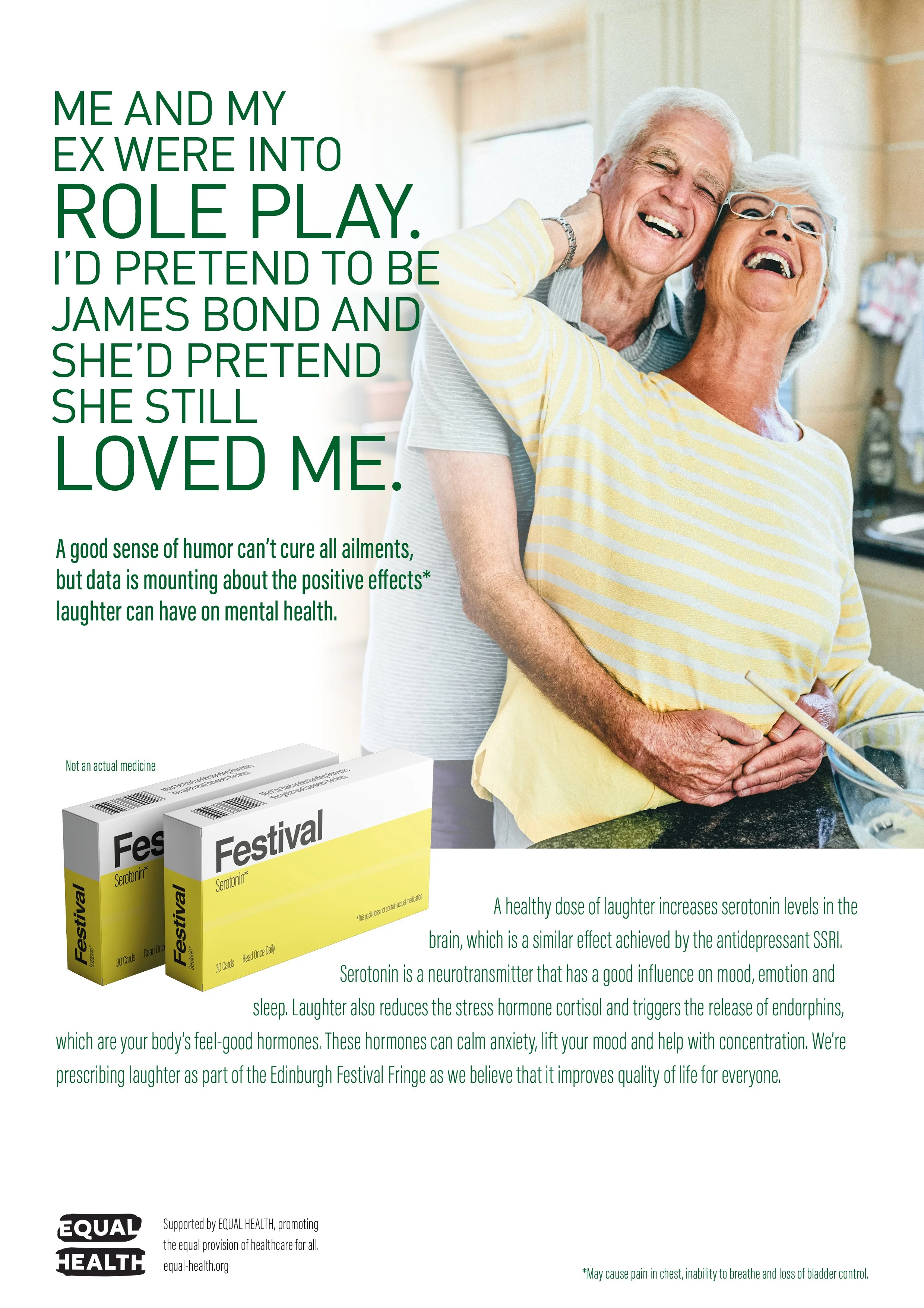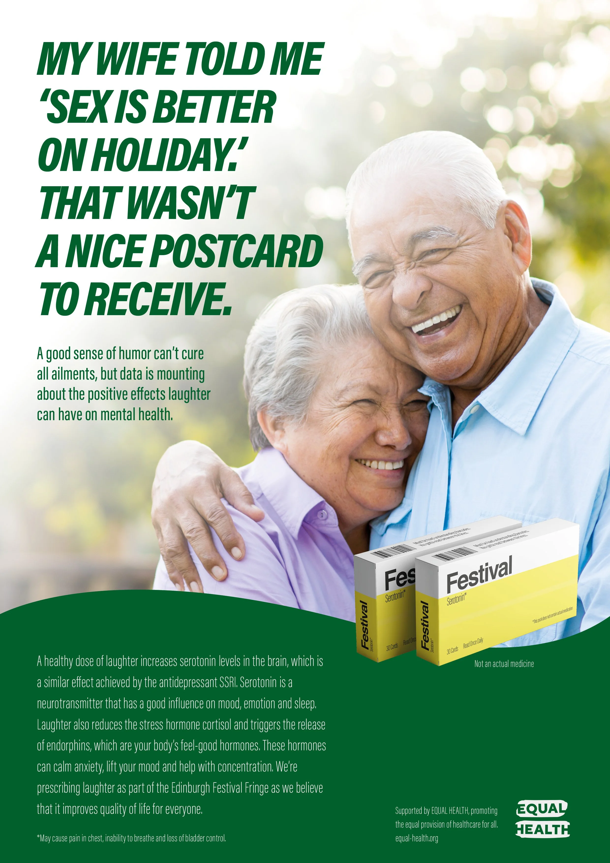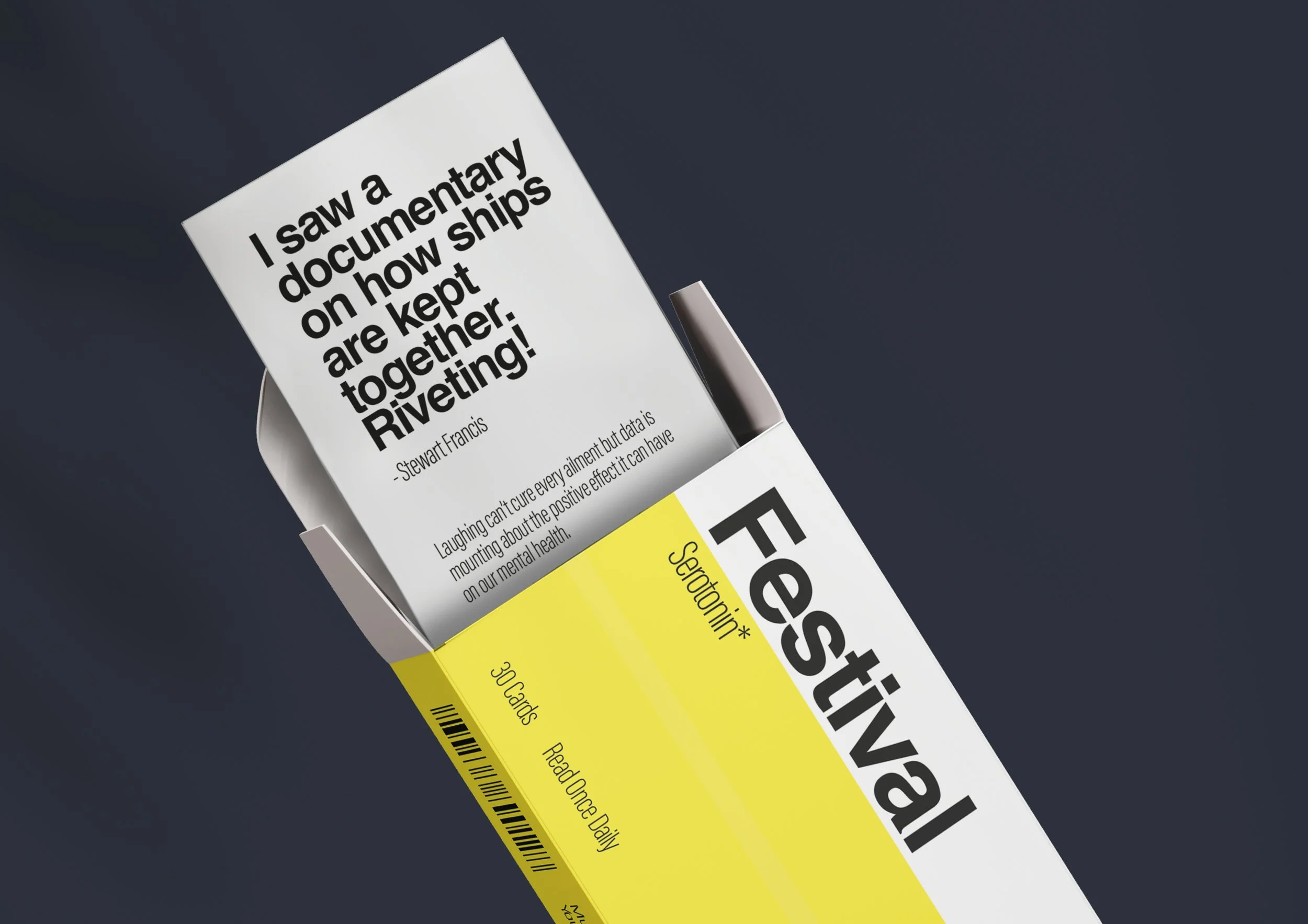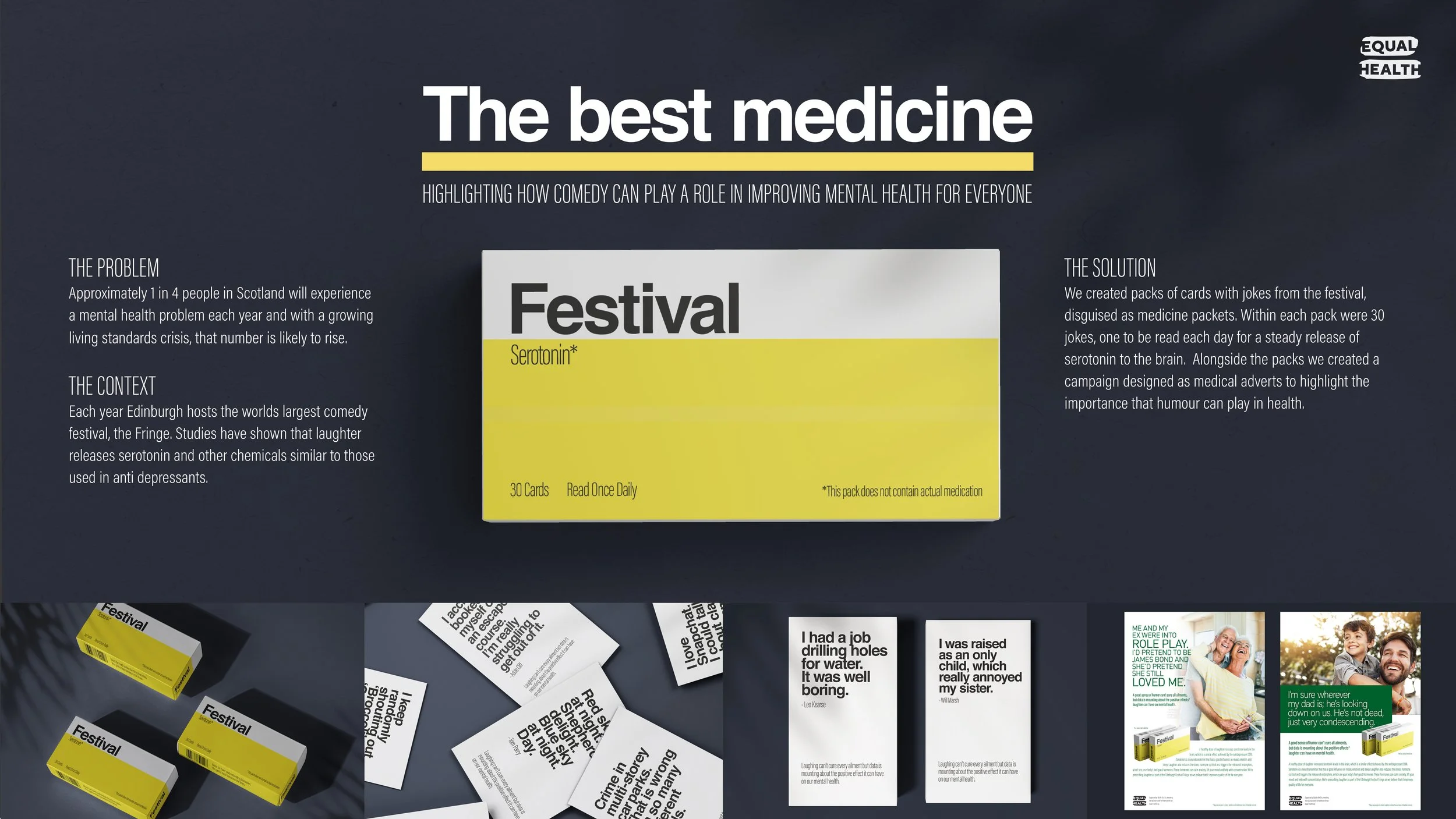 We created packs of cards with jokes from the festival, disguised as medicine packets. Within each pack were 30 jokes, one to be read each day for a steady release of serotonin to the brain. Alongside the packs we created a campaign designed as medical adverts to highlight the importance that humour can play in health.