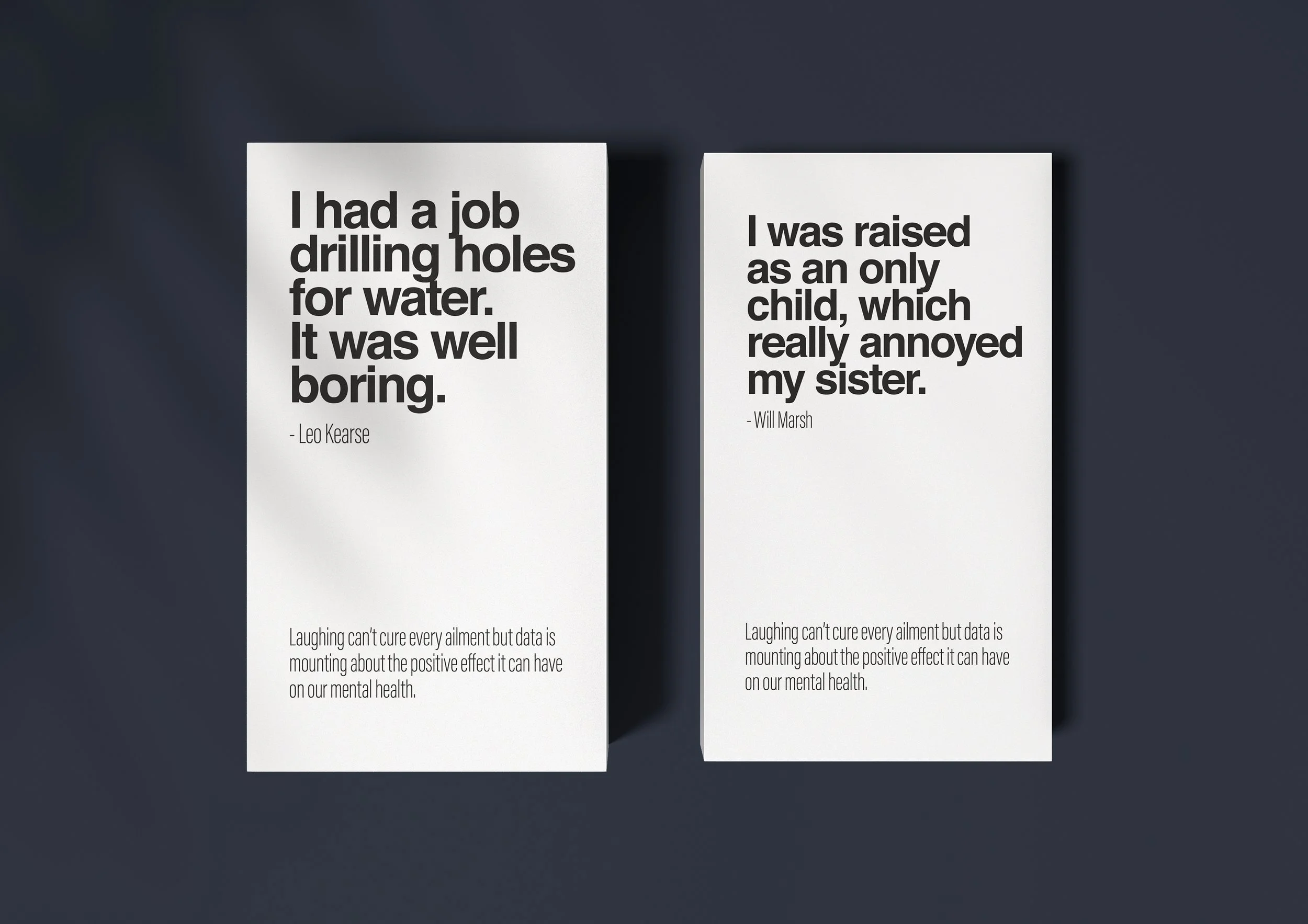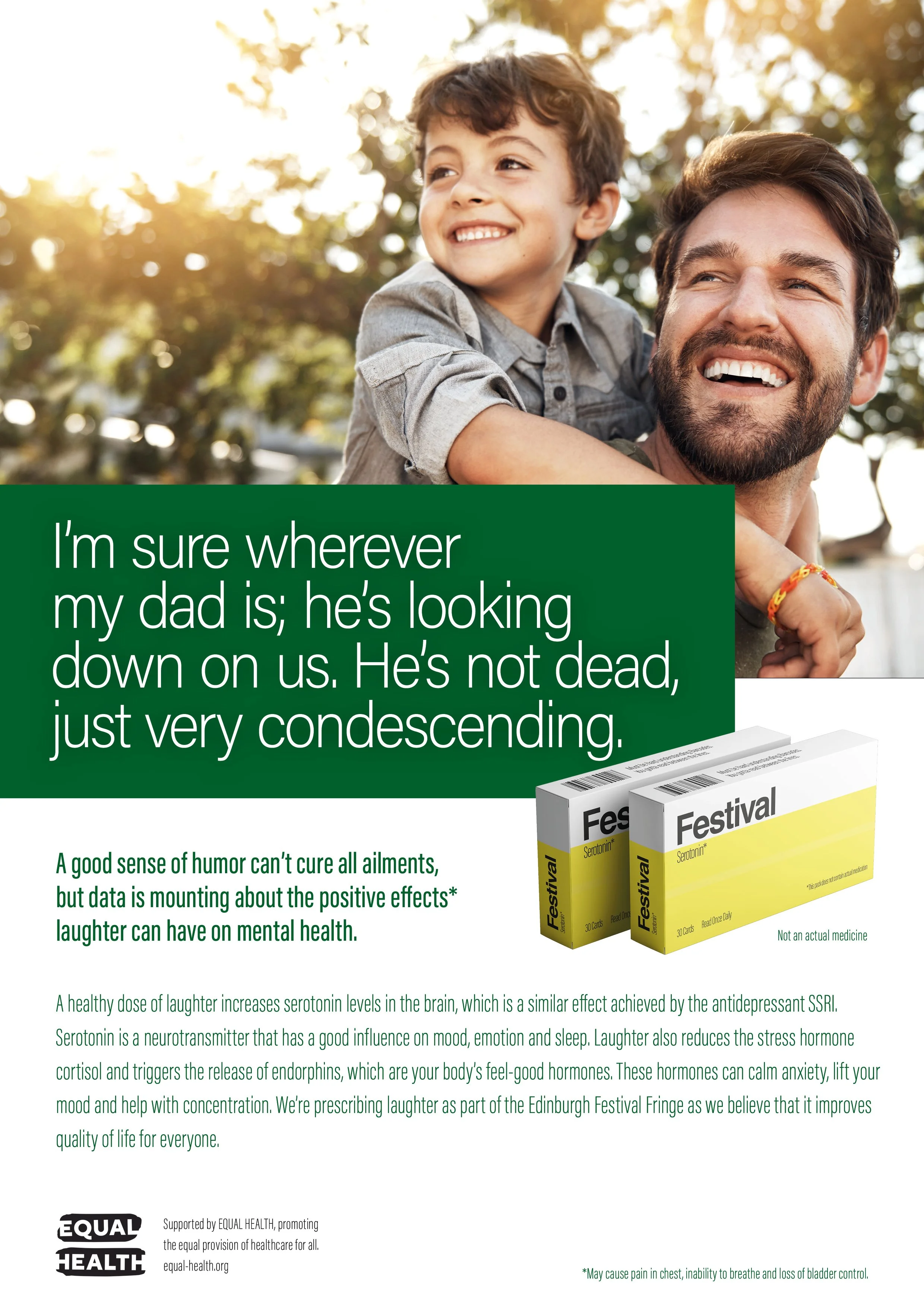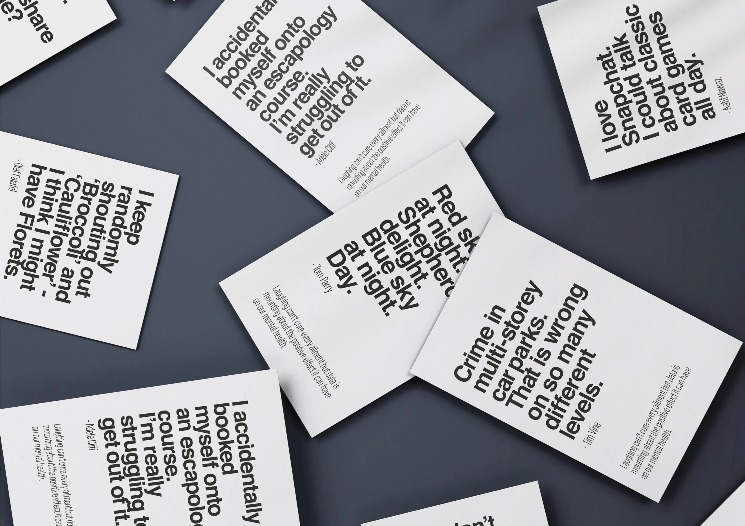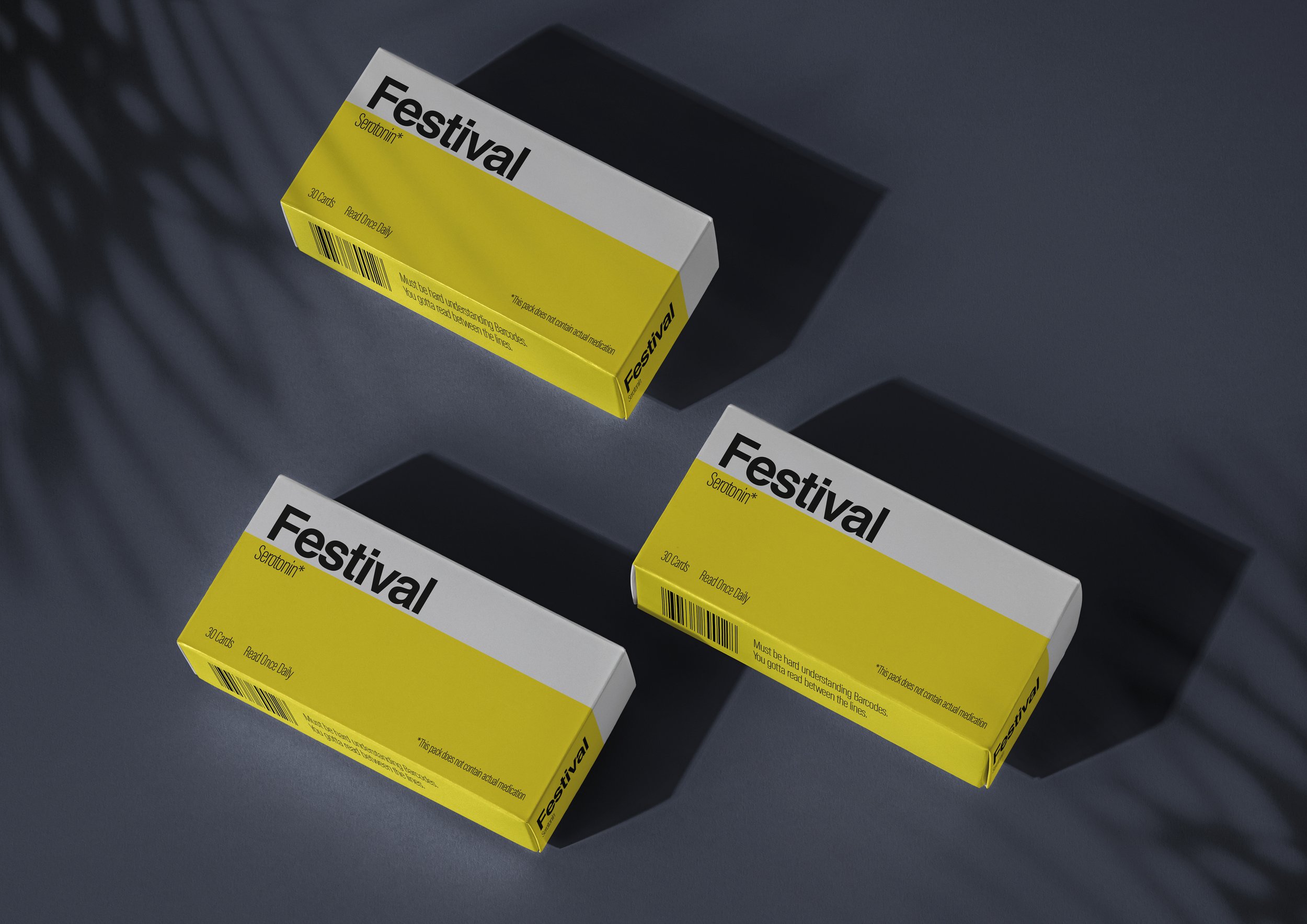 We created packs of cards with jokes from the festival, disguised as medicine packets. Within each pack were 30 jokes, one to be read each day for a steady release of serotonin to the brain. Alongside the packs we created a campaign designed as medical adverts to highlight the importance that humour can play in health.